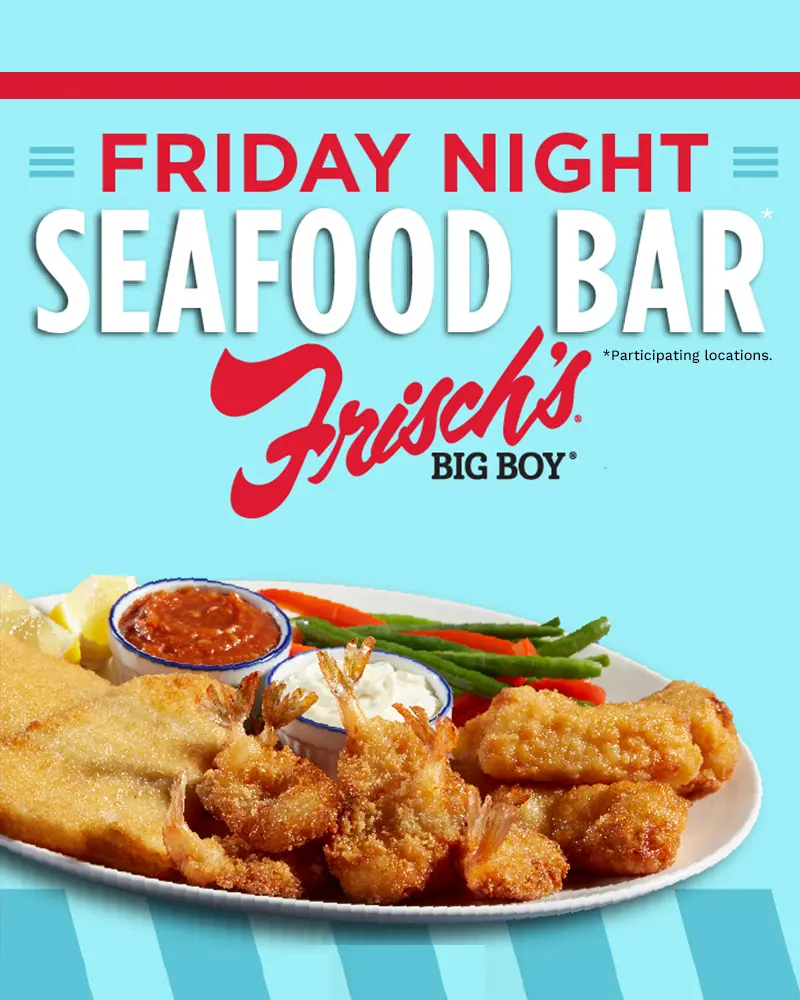 Join us every Friday Night to kick off the Unlimited Seafood Bar, our bars will include a wide array of seafood including our crispy fish, hand-battered shrimp, Frisch’s Famous Tartar Sauce, soup, salad and dessert. You can also enjoy our crispy stacked Fish Sandwich with two pieces of crispy white fish, two slices of American Cheese, shredded lettuce, pickles and Frisch’s Famous Tartar Sauce.